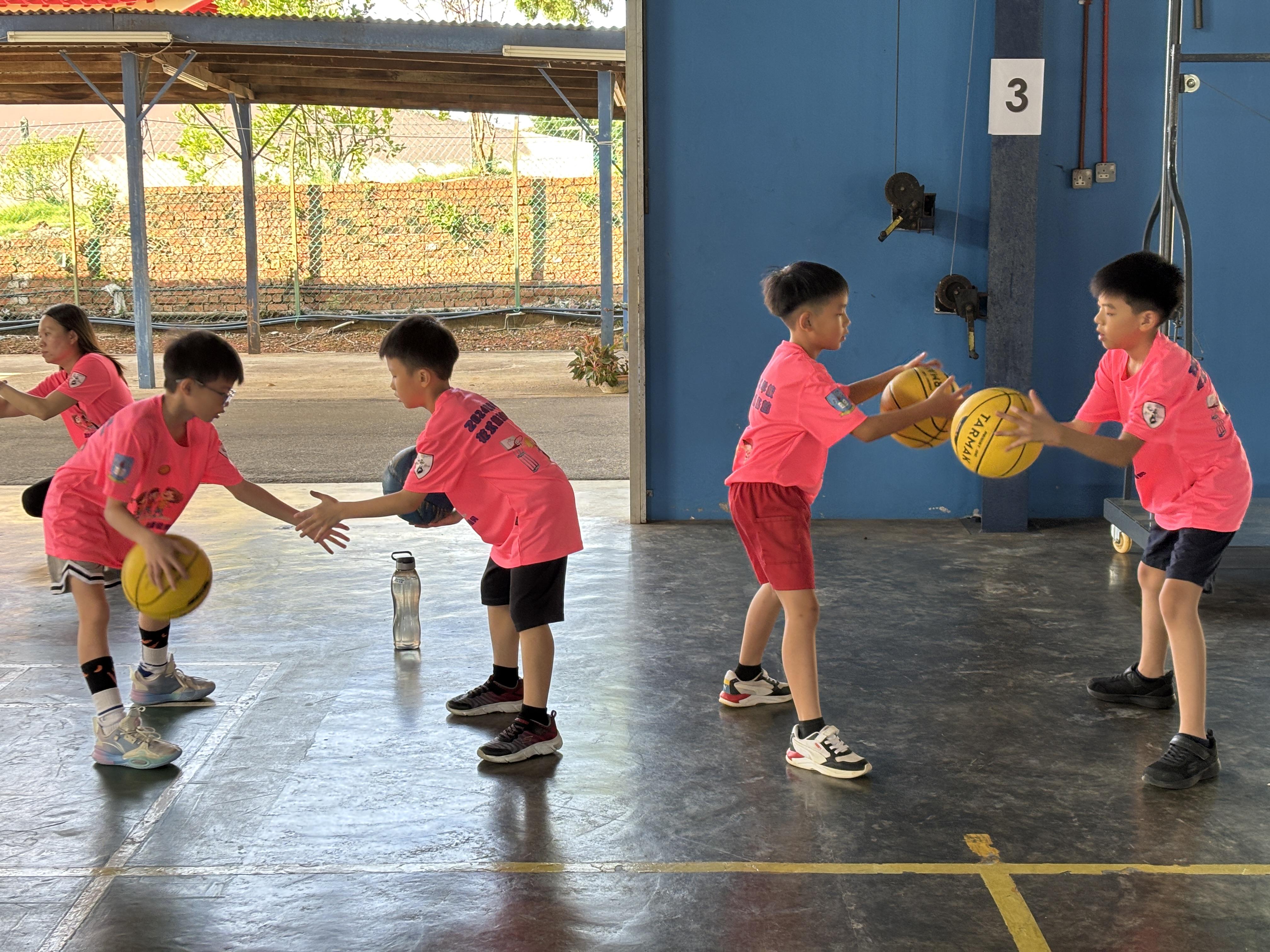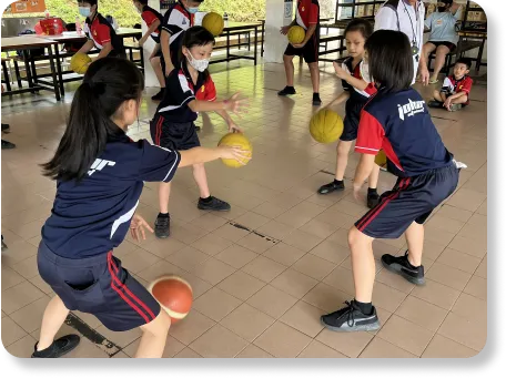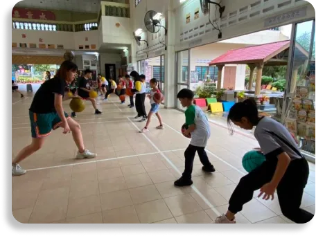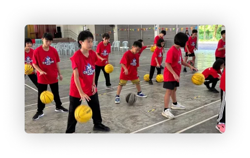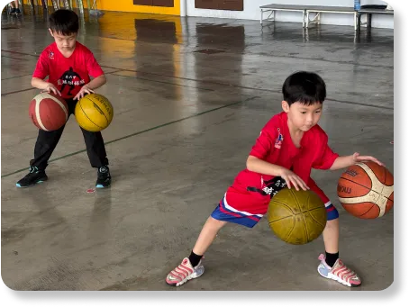 Children will learn to use two basketballs at the same time, guiding both hands to move together and perform opposite movements simultaneously.